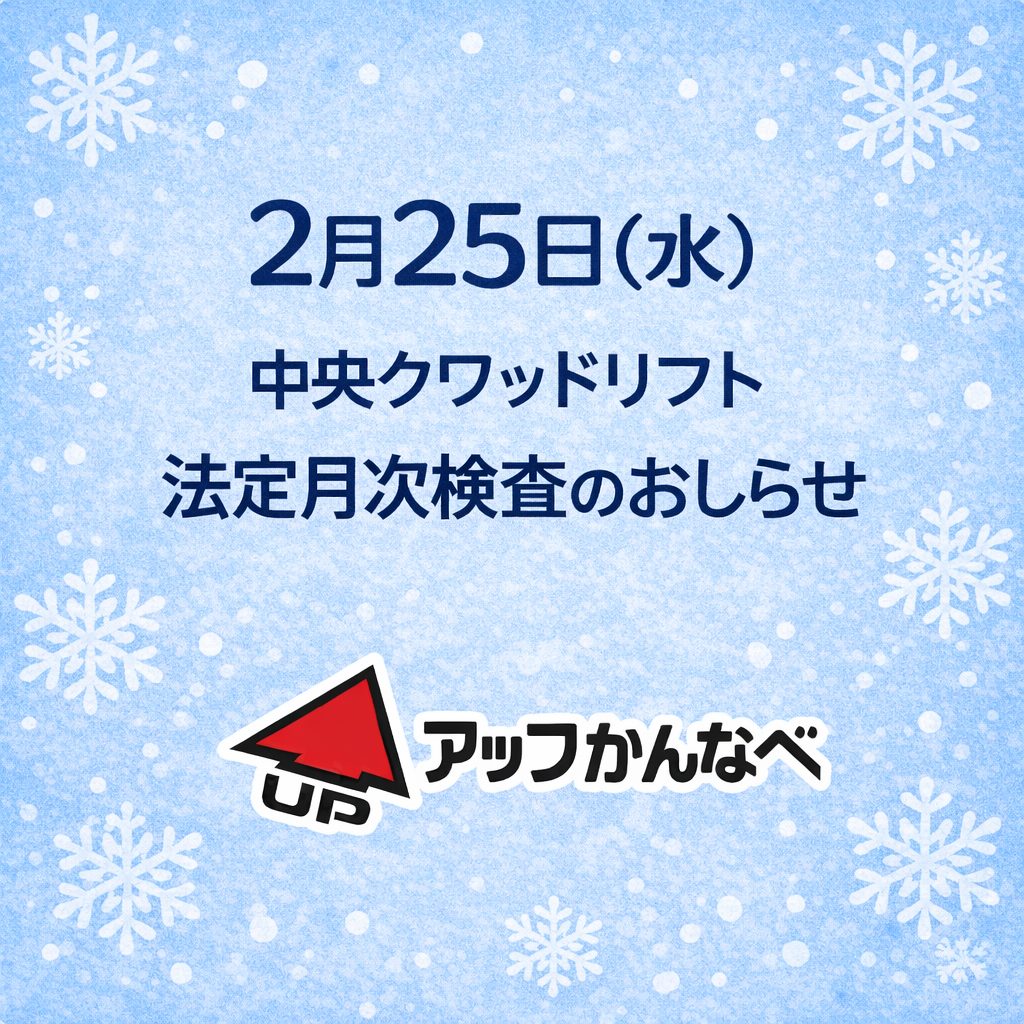 山頂クワッドリフトは、法定月次検査の実施に伴い、営業時間を変更して運行いたします。